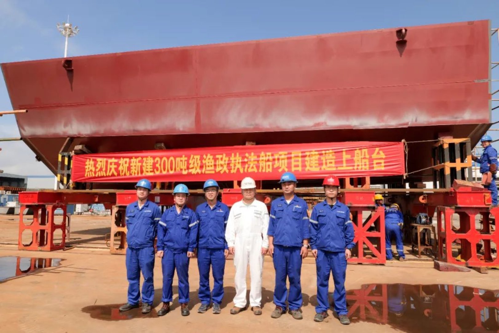 10月8日,由武昌造船为连云港市海洋与渔业综合行政执法支队打造的新建300吨级渔政执法船,在监理、项目三总师及参建单位相关负责人的见证下,顺利上船台,标志该船正式进入船台搭载阶段。