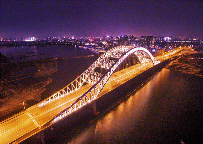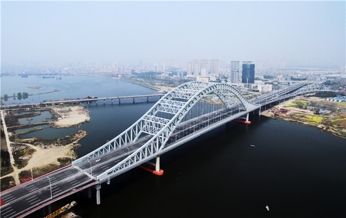 新六两河大桥位于老六两河大桥上游300米,大桥全长1945米,桥面宽约45米,双向八车道,主跨达到240米。为了不影响唐白河的通航能力,大桥采用下承式连续刚桁架拱桥,从远处看,大桥形似一道横跨唐白河的美丽彩虹,颜值爆表,这种类型的桥梁不仅在襄阳是第一座,也是鄂西北首座,被襄阳市民们誉为一张新的城市名片。