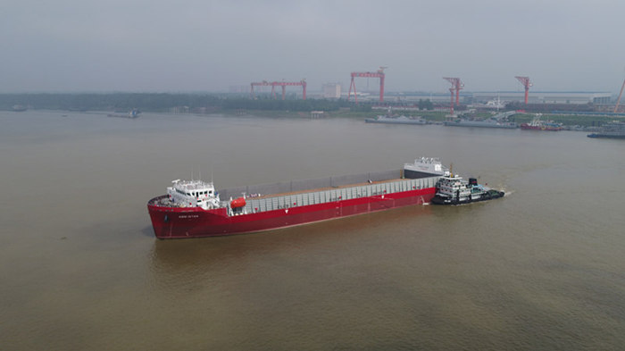武船集团双柳武船承建的该型船共四艘,1号船已于2018年5月16日在江苏省南通市顺利交付。13000DWT甲板运输船是国内首个具备完全自主知识产权的散货船,采用海工院自主研发的双尾鳍专利船型,全钢制焊接结构,总长约130米、型宽26米、型深8米,载重量13000吨,设两台主机,单机最大功率1600KW,航速10.2节。在设计方面,海工院通过优化线型设计,其性能参数与国际同类型船舶相比节能提效14.1%,优势明显,并通过优化船舶综合布置,细化施工设计,成功攻克浅吃水型船舶重量重心与稳性控制、薄板焊接变形、船舶减振降噪等难题。该项目质量控制上,受到船东、船检的一致好评。