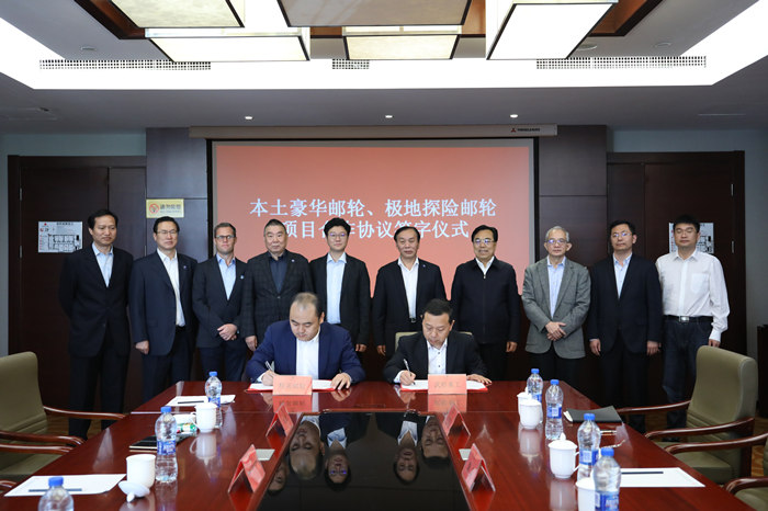 5月24日,武船集团与精英邮轮签署了“本土豪华邮轮、极地探险邮轮项目合作协议”。武船集团党委委员、北船重工总经理韩兵与精英邮轮董事长张鹏代表双方签约,青岛市李沧区委书记王希静,武船集团党委书记、董事长杨志钢出席并见证了签约仪式。