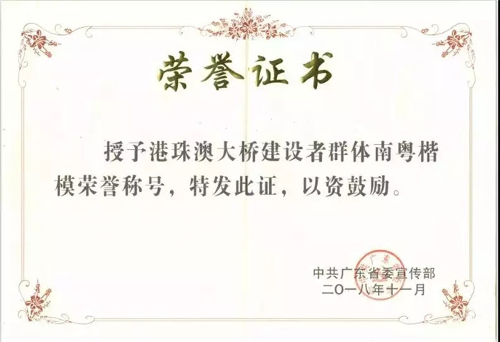 11月3日,广东省委宣传部授予港珠澳大桥建设者群体 “南粤楷模”称号。广东省委常委、宣传部部长傅华出席活动,并会见了港珠澳大桥建设者代表。