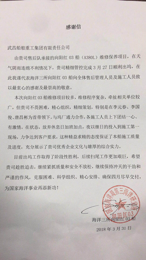 这封姗姗来迟的感谢信中,国家海洋局海洋三所表达了对武船集团全体售后人员最衷心的感谢及最崇高的敬意,特别对公司售后小组精心组织策划、团结一心、夜以继日、精益求精的态度给予高度赞扬和肯定!