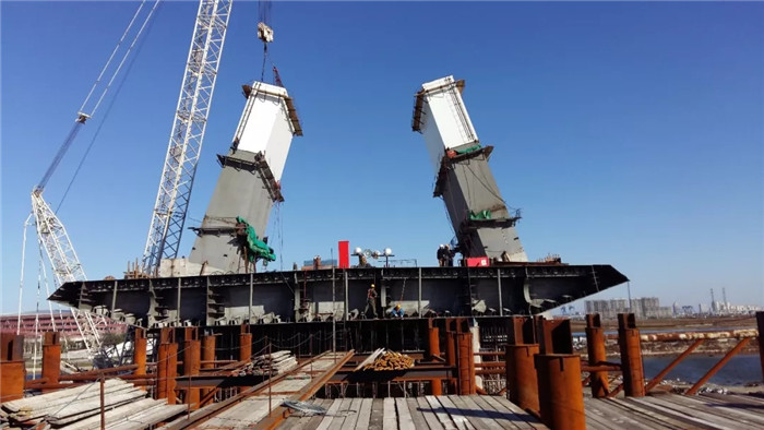 由于沿海地区风力较大,考虑其特殊的结构造型和现场施工条件的限制,武船重工股份经过反复论证后,采取了“超大型构件液压同步提升施工技术”进行竖向转体的方式安装,变风险较大的高空作业为地面施工,并就提升方案进行了多次探讨和实地演练,确保方案在实施过程中万无一失,南、北侧轴线偏差控制在5mm以内,各项指标均达到设计要求,施工及合龙过程异常顺利。该施工工艺在国内北方沿海地区首次成功使用,大幅缩短了工期,降低了施工成本和安全风险,安装质量和整桥受力状态都有显著提高。