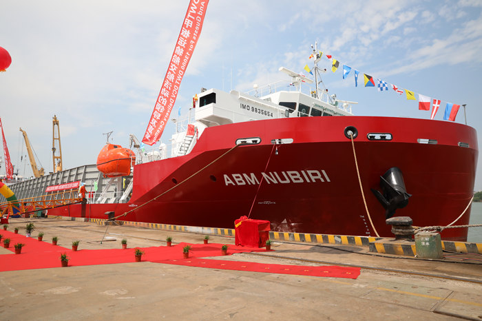 交付仪式现场,武船集团副总经理田军、三泰集团总裁金星阔、路易达孚集团总经理杜・艾玛纽、PT ABM公司总经理拉姆・马修、三星物产公司副总裁李秉顺先后致辞。三泰集团总裁夫人金海鸥女士随后为船只命名。