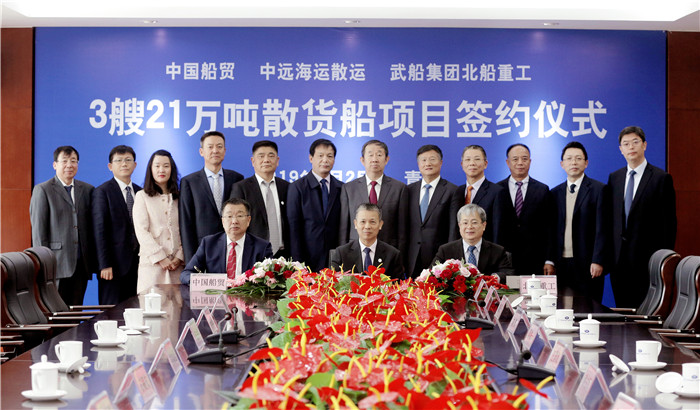 4月25日,武船集团北船重工与中远海运散货运输有限公司举行新造3艘21万吨散货船项目签约仪式。这是双方首次进行的一次重大战略合作,也是北船重工在造船市场上开发的新船型。