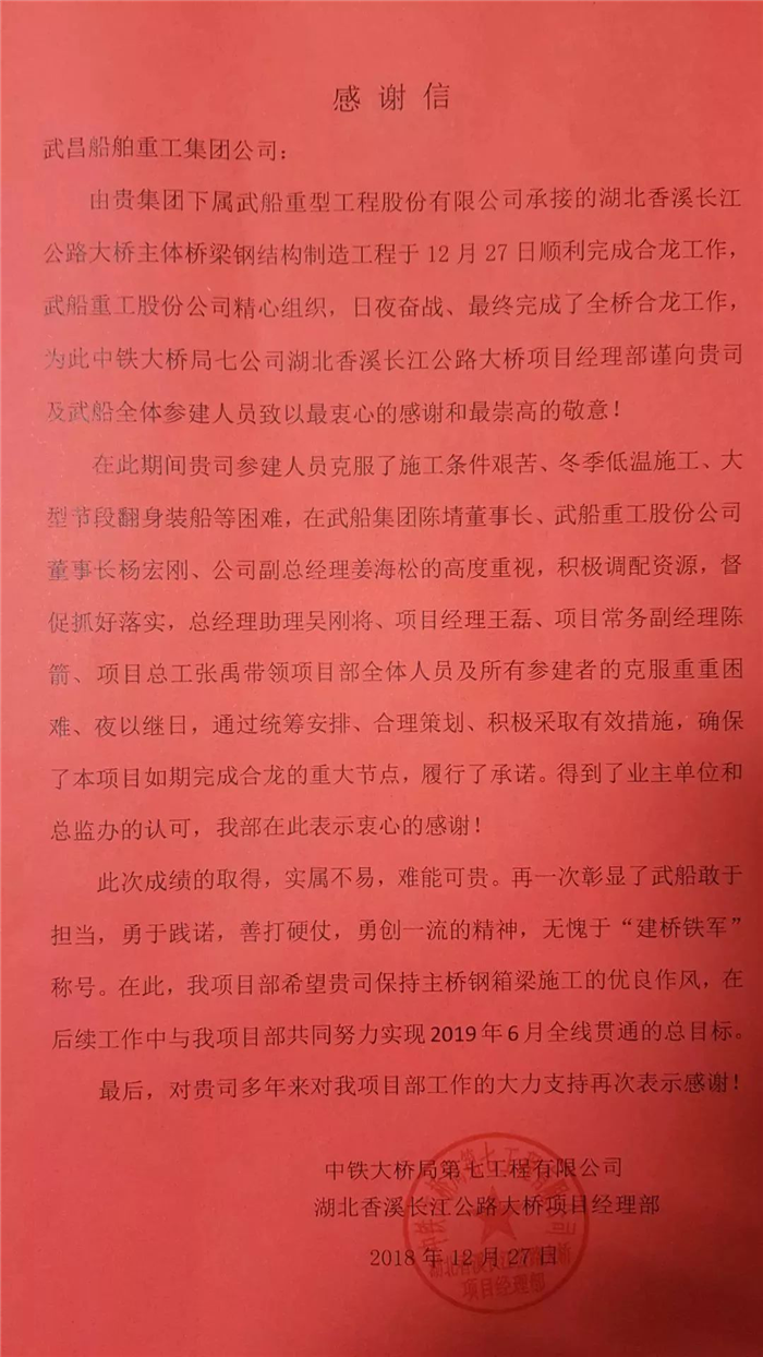 合龙仪式上,香溪长江大桥业主、总包单位对公司在大桥建设过程中表现的守信担当、硬朗作风的工作作风表示高度赞扬,并向武船集团发来感谢信,同时希望公司能继续保持优良作风,提前高效地完成后续工作任务。