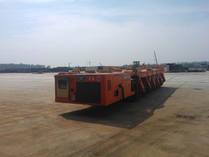 整车宽度 2.43m,是一种配备了液压升降、液压驱动转向、液压驱动行走的特种车辆,用于重型货物的场地内周转运输,有横向驾驶、普通、前轴转向、后轴转向、 斜向、角向 90°、原地转圈七种转向模式。车轮大转角±110º。每轴线总质量 48t,每轴线载质量 43.5 t。配备无线遥控器(也可有线使用)。 液压管路、电气电缆连接均采用液压快速接头和电气连接器,可多车并车,效率高。