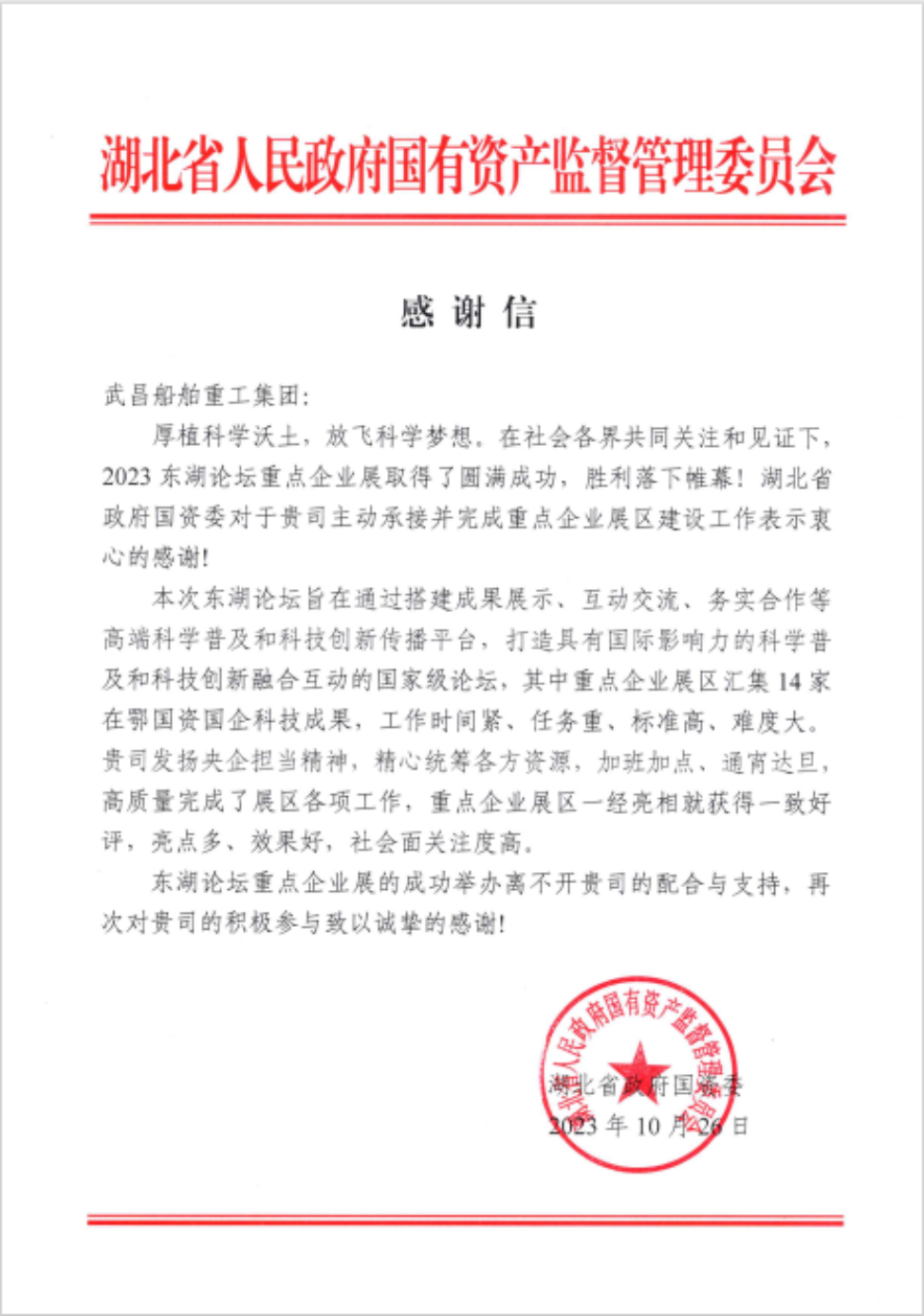 “发扬央企担当精神,精心统筹各方资源”“亮点多,效果好,社会面关注度高”......这是来自湖北省政府国资委的感谢信对武昌造船的赞扬!